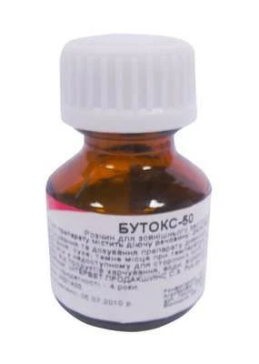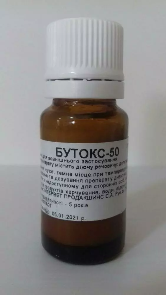 Бутокс, 10 мл - ветеринарний препарат для боротьби з ектопаразитами: іксодові, коростяні кліщі, воші, власоєди, мухи, гілки, клопи, мошки та ін. Застосовують у формі водної емульсії методом обприскування або купання тварин.