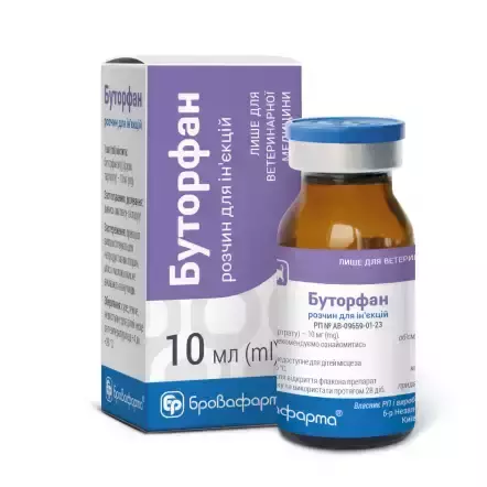 ТОВ “Бровафарма” випустило на основі буторфанолу препарат Буторфан. Він є високоефективним та безпечним знеболювальним засобом для коней, котів і собак і має такі особливості:
