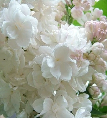 Один з кращих сортів білого махрового бузка французької селекції. Квіти махрові, зібрані у великі суцвіття сніжно - білого кольору з приємним ароматом. Бутони й основа квіток – зеленувато-срібляста. Високі пірамідальні суцвіття виглядають ефектно і виразно, дуже великі завдовжки 30 см. Блискуче, серцеподібне, темно-зелене листя служить відмінним фоном для білосніжних суцвіть. Віддає перевагу відкритим сонячним ділянкам на родючих добре дренованих грунтах. Морозостійкий. Відмінно підійде і для формування живоплоту і для одиночних солітерних посадок. Ідеальний для зрізання у букети.