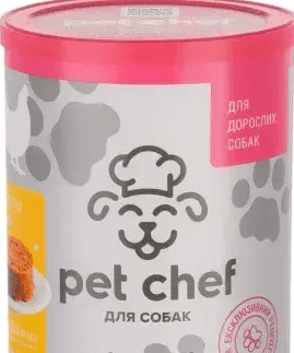 Pet Chef — ексклюзивний апетитний ситний продукт для собак за новою рецептурою в зручних банках, захищених кришкою. Консерви Pet Chef виготовляються з українського м'яса та субпродуктів. Мінімальний відсоток зернових у преміальному кормі Pet Chef є для збалансування харчування вашого собаки, забезпечує повний спектр необхідних поживних речовин, які потрібні кожного дня його щасливого життя. Pet Chef — це смачно, зручно та поживно.