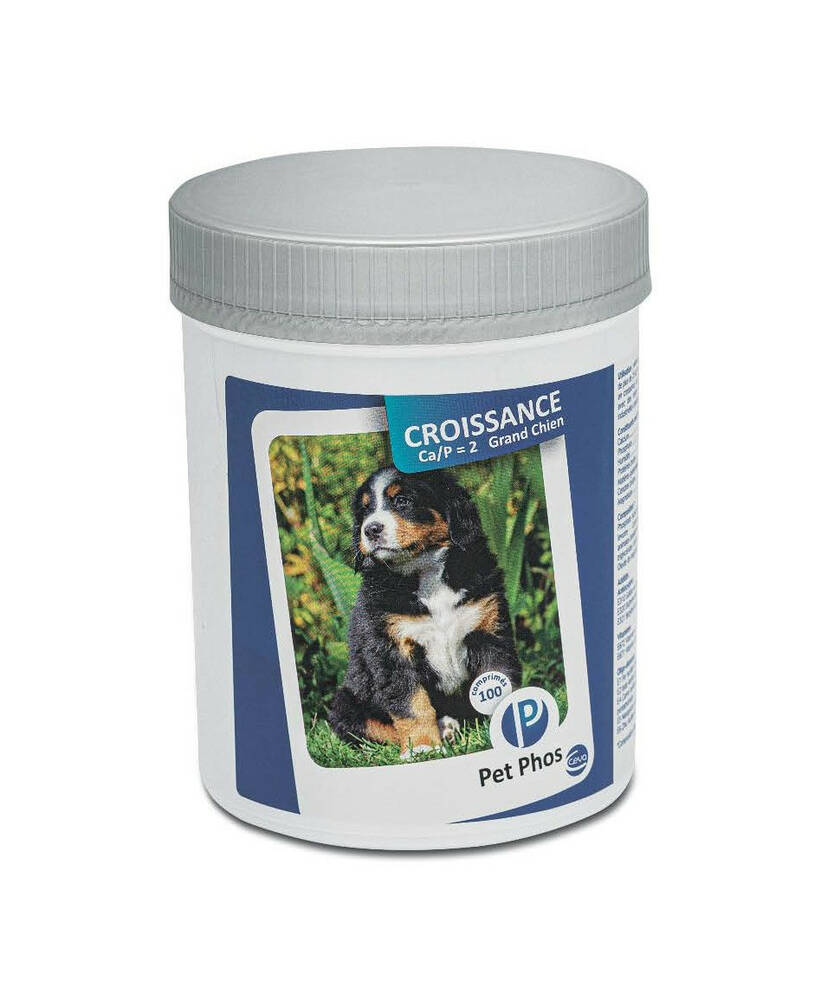 Вітаміни Pet Phos Croissance Ca/P=2 Large Breed - вітамінно-мінеральний комплекс для собак масою тіла понад 25 кг, призначений для цуценят, вагітних, лактуючих та дорослих собак, яких годують промисловими кормами чи домашнім раціоном.