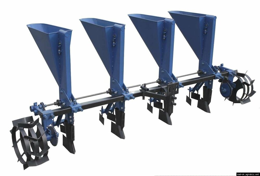 Привод механизма дозирования от опорно-приводных колес. Для обеспечения стабильной работы, на неровном грунте, применена двухвальная система механизма дозирования, с разделённым приводом. Шаг посадки в ряду: 110 мм, 125 мм, 140 мм, регулируется изменением передаточного числа на цепном редукторе. Для компенсации длины цепи применён натяжитель. Сошник и загортачи регулируемые, глубина посадки 60-80 мм. Ширина междурядий выставляется в пределах: 200-530 мм. Ширина колеи 2220 мм.