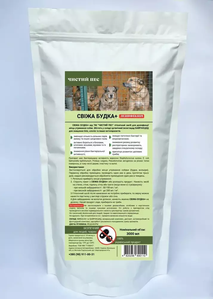 Гігієнічний засіб "СВІЖА БУДКА+" від тм "ЧИСТИЙ ПЕС" для дезінфекції місць утримання собак. Містить у складі органічний інсектицид БАЙРАКЦИД для знищення блох, клопів та інших ектопаразитів.
