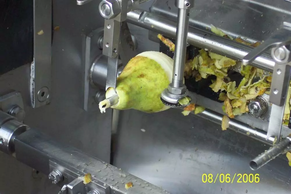 Тут фрукти перевертаються та очищаються з регульованою швидкістю та видаляється сердцевина. Під час остаточної операції очищення від шкірки та серцевини фрукти проходять через додаткову систему нарізання, яка дозволяє нарізати їх на дольки або кубики.