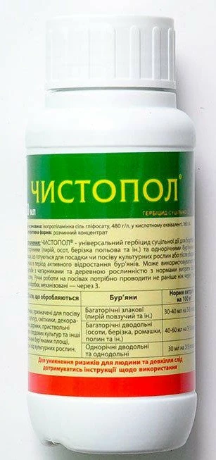 «Чистопол» – універсальний гербіцид суцільної дії для боротьби з багаторічними та однорічними бур'янами на площах, які готуються для посадки або посіву культурних рослин або після збору врожаю в період активного відростання бур'янів.