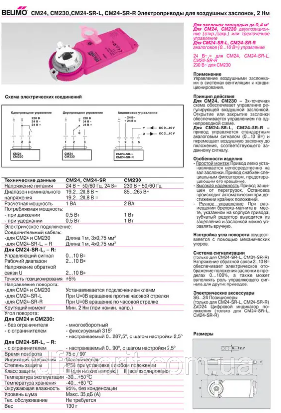 Для Belimo CM24-SR-L(R) – привод управляется стандартным аналоговым сигналом (0...10 В=) и перемещает воздушную заслонку до положения, соответствующего за данному сигналу.