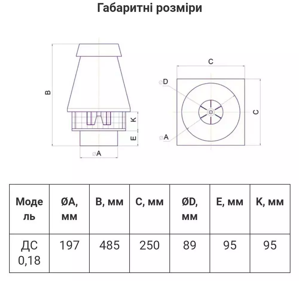Даховий димосос  ДС 0,18 призначений для примусового димовидалення з димоходів твердопаливних котлів, буржуйок, печей, бульер'янів, камінів та інших опалювальних агрегатів. Також підійде для дахової вентиляції у разі видалення гарячого повітря до +140 градусов.