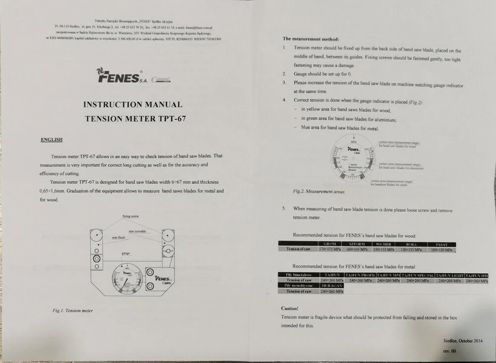 Шкала пристрою дозволяє вимірювати натягнення обох пив для металу і дерева. Крім того, він дозволяє вимірювати на неприкріпленій та натягненій стрічці.