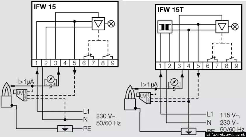 • потенциально свободные контакты для сигнализации наличии пламени (1- нормально зомкнутый, 2- нормально разомкнутый).