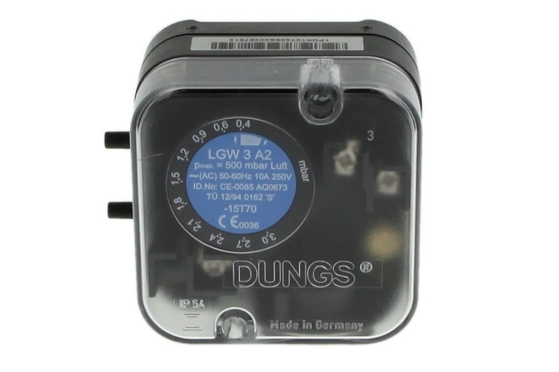 Дифференциальный датчик-реле давления LGW 3 A2 DUNGS применяют как переключающее устройство при понижении или повышении давления. Реле давления LGW3A2 имеет соединение в виде штуцера 1/4 дюйма. У датчика давления LGW 3 A2 DUNGS арт. 107409 есть шкала от 0.4 до 3 mbar, настройку выполняет регулировочное кольцо.