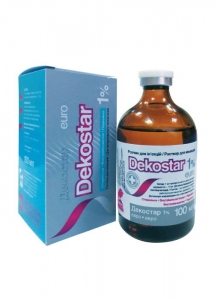 Опис Прозорий безбарвний або блідо-жовтий розчин для ін'єкцій. Склад: 1 мл препарату містить діючу речовину: дорамектин - 10 мг. Фармакологічні властивості Декостар готовий до використання стерильний розчин, який містить діючу речовину дорамектин. Дорамектин - нова речовина групи авермектинів, виявляє широкий спектр системної нематодоцидної, інсектицидної та акарицидної дії, ларвоцидні та овоцидні властивості. Модулює активність іонів хлору у нервовій системі і м'язах нематод та членистоногих. Зв'язуючись зі специфічними рецепторами, збільшує проникність синаптичних мембран для іонів хлору, що призводить до блокади активності нервових та м'язових клітин нематод і членистоногих, що спричинює параліч і загибель паразитів. У ссавців ці рецептори локалізовані лише у центральній нервовій системі, а дорамектин не проникає через гемато-енцефальний бар'єр і, тому у рекомендованих дозах є безпечним для ссавців. Препарат у рекомендованих дозах не має мутагенної, тератогенної і ембріотоксичної дії. Декостар легко резорбується із місця введення, має високу ефективність і не виявляє негативного впливу на організм тварин. Фармакокінетичні властивості дорамектину забезпечують тривале збереження терапевтичних концентрацій препарату у крові тварин і захист їх від паразитарних захворювань та реінвазії протягом тривалого часу. Застосування Лікування і профілактика захворювань великої рогатої худоби, овець, свиней, що викликаються нематодами та ектопаразитами: Велика рогата худоба: шлунково-кишковими нематодами (дорослі і личинки 4-ої стадії): Ostertagia ostertagi (включно з інгібованою ларвальною стадією), O. lyrata, Haemonchus placei, Trichostrongylus axei, T. colubriformis., Cooperia oncophora, C. pectinala, C. punctata, C. sumabada, Nematodirus spathiger, Bunostomum phlebotomum, Strongyloides papillosus. Oesophagostomum radiatum, Trichuris spp. легеневими гельмінтами (дорослі і личинки 4-ої стадії): Dictyocaulus viviparous; очними гельмінтами (статевозрілі): Thelazia spp.; личинками підшкірного овода (паразитичні стадії): Hypoderma bovis, H. Lineatum; вошами Haematopinus euresternus, Linognatus vituli, Solenopotes capillatus; коростяними кліщами: Psoroptes bovis, Sarcoptes scabiei. Також застосовується для лікування та профілактики захворювань, викликаних гельмінтами шлунково-кишкового тракту Nematodirus helvanicus, вошамий Damalinia bovis та коростяними кліщами Chorioptes bovis. Препарат запобігає реінвазії великої рогатої худоби від: Ostertagia ostertagi - 35 діб; Cooperia oncophora -21 добу; Dictyoaculus viviparus - 35 діб; Bunostomum phlebotomum - 22 доби; Oesophagostomum radiatum - 21 добу; Trichostrongilus axei - 28 діб; Linognatus vituli - 28 діб; Psoroptes bovis - 42 доби; Haemonchus placeі - 28 діб. Для більшої ефективності рекомендується обробляти товарне поголів'я тварин препаратом Декостар 1% при переводі на пасовища і вдруге через 8 тижнів. Вівці: шлунково-кишковими нематодами (дорослі і личинки 4-ої стадії): Chabertia ovina (статевозріла стадія), Cooperia curticei (стадія L4), C. oncophora, Gaigeria pachycelis, Haemonchus contortus, Nematodes battus (стадія L4), Ostertagia (Teladorsagia) circumcincta, Oesophagostomum columbianum, Strongyloides papillosus, Tricnostrongylus axei, Trichostrongylus columbiformis, Trichostrongilus vitrinus, Trichuris spp (статевозріла стадія) ефективно діє на личинкові стадії L4, навіть на ті, котрі природно нечутливі до препаратів похідних бензімідазолу. для ефективного лікування та профілактики тварин щодо дорослих та личинкових стадій L4 Nematodirus battus рекомендовано застосовувати дозу 300 мкг/кг м. т.; коростяними кліщами: Psoroptes ovis; легеневими гельмінтами: Dictyocaulus filaria (дорослі); гельмінтами носової порожнини: Oestrus ovis. Свині: шлунково-кишковими нематода