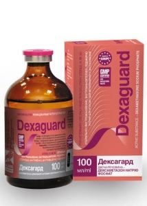 Склад. 1 мл препарату містить: дексаметазон натрію фосфат - 2,64 мг (еквівалентно 2 мг дексаметазону). Фармакологічні властивості. Дексагард - глюкокортикостероїдний препарат, який має протизапальну, протиалергічну, десенсибілізуючу, протишокову, імунодепресивну та антипроліферативну дії. Дексаметазон зменшує або запобігає відгук тканин на запальний процес шляхом зниження розвитку ознак запалення без впливу на його причину. Дексаметазон впливає на всі стадії запального процесу. Зменшує: проникність кровоносних судин, пригнічує фагоцитоз і вивільнення хімічних посередників запалення,концентрацію Т-лімфоцитів, моноцитів і еозинофільних лейкоцитів, зв'язування імуноглобуліну з рецепторами поверхневих тканин і пригнічує синтез і вивільнення інтерлейкінів; кількість циркулюючих лімфоцитів (Т- і В-клітин), моноцитів, еозинофілів і базофілів, кісткоутворення і посилює кісткову резорбцію, концентрацію кальцію в плазмі, приводячи до вторинного гіперпаратиреозу та подальшого стимулювання остеокластів, і прямого інгібування остеобластів. Збільшує: засвоєння глюкози; ліполіз і метаболізує жирні кислоти з жирових тканин. Пригнічує синтез тиреопропного і фолікулостимулюючого гормонів. Застосування. Метаболічні процеси: кетоз у ВРХ або післяродова токсемія у овець та свиноматок. Неінфекційні запальні процеси: артрит, периартрит, тендовагініт, бурсит, вивихи, запалення м'язів, кісток і сухожиль. Гострі інфекційні захворювання (гострий мастит, метрит, пневмонія), в комбінації з відповідною антибактеріальною терапією. Алергічні стани, наприклад, астма, алергічні ураження шкіри (екзема, кропив'янка, свербіж та ін.), ламініт у коней і ВРХ, укуси змій. Стресовий і шоковий стан; Токсемія під час останньої стадії вагітності (протягом 2-4 днів). Дозування. Препарат вводять внутрішньовенно, внутрішньом'язово або підшкірно (собаки, кішки): - ВРХ, коні: 5-10 мл на 400 кг маси тіла. Для ініціювання отелення у корів - протягом 1 тижня перед розтелом в дозі 2,5 мл на 100 кг маси тіла; - свині: 1,5 мл на 50 кг маси тіла; - вівці, кози, телята: 1-2 мл на 50 кг маси тіла. При післяпологовий токсемії і для ініціювання окоту у овець і кіз: 6 мл препарату на 50 кг маси тіла; - собаки, кішки: 0,25-0,5 мл на 5 кг маси тіла. При необхідності препарат вводять повторно: собакам і котам з 2-денним інтервалом; іншим тваринам з 3-4-денним інтервалом. У комплексі протишокової терапії препарат застосовують шляхом повільної внутрішньовенної ін'єкції десятиразової протизапальної дози, повторно - через 8-12 год. Внутрішньосуглобове введення: в залежності від зони ураження і маси тіла тварини - від 0,25 до 4 мл. Протипоказання. Гіперчутливість до препарату, системна грибкова інфекція, активна форма туберкульозу, цукровий діабет, системні інфекції, артеріальна гіпертензія, гострі розлади вищої нервової діяльності, період вагітності, виразкові ураження шлунка та/або кишечника, вірусні захворювання, остеопороз, синдром Іценко-Кушинга, підвищена чутливість до компонентів препарату. Побічна дія. Затримка в організмі води і натрію, втрата калію і кальцію, гіпертензія, м'язова слабкість, остеопороз, виразка з можливою наступною перфорацією і кровотечею, панкреатит, погіршення загоєння ран, судоми, запаморочення, розвиток синдрому Іценко-Кушинга, порушення статевого циклу, прояви латентного цукрового діабет