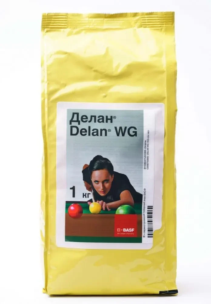 В день обработки подготавливают рабочий раствор для опрыскиваний: разводят 14 г средства Делан в ведре воды.