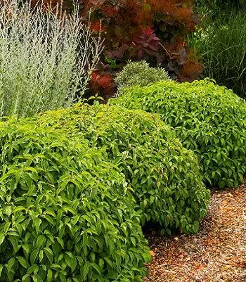 Відрізняється розпростертою формою крони, малими розмірами і жовтуватими пагонами з червоними верхівками. Однорічні пагони тонкі, взимку дуже декоративні - червоно-коричневі, біля основи світліші, іноді оранжево-зелені або оливково-зелені, стара деревина темно-оливково-зелена. Листя овальні, яскраво-зелені, довго не опадають. Восени фарбуються в усі відтінки жовтого, оранжевого, червоного кольорів. До грунтів невимогливий. Віддає перевагу зволоженим ділянкам, переносить надмірне зволоження. Чудовий в якості грунтопокривної рослини. Посадка 2-3 шт / м2.