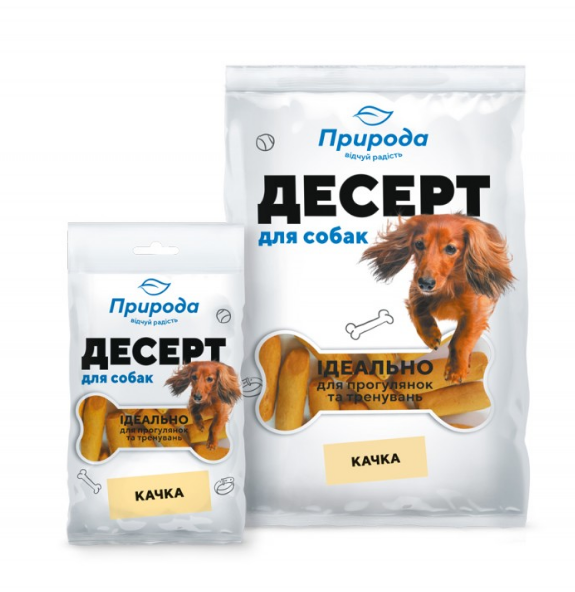 Десерт «Качка» для собак - ласощі всіх порід собак у вигляді печива. Десерт як повноцінні ласощі використовується при дресируванні, а також як аргумент у формуванні довірчих відносин з собакою. Це ефективний засіб для чищення зубів, масажу ясен та джерело корисних речовин: білків, вуглеводів, клітковини. Печиво «Качка» має привабливий запах і чудово підходить для гри. Невеликий розмір робить десерт зручним для розгризання.