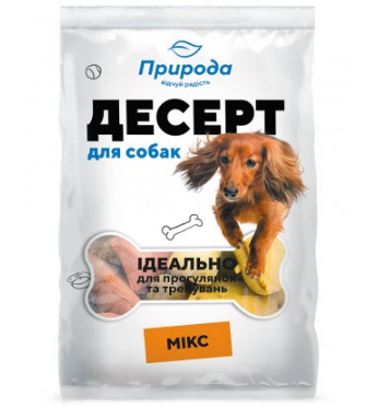 Десерт «Мікс» для собак - печиво у формі кісточок та подушечок буде незамінним для всіх власників собак під час дресирування для закріплення навичок і створення теплих стосунків. Ласощі мають складати не більше 8-10% денного раціону собаки. Вони збагатять меню корисними речовинами та мікроелементами, допоможуть позбавитися неприємного запаху з пащі улюбленця, помасажують ясна, покращать травлення. Для виготовлення використовуються лише натуральні компоненти, в рецептурі немає консервантів та ГМО.