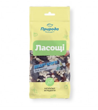 Десерт-мікс «Асорті» для декоративних птахів - десерт збагачує раціон декоративних птахів вітамінами та мікроелементами. Рекомендовано для середніх та великих папуг. Десерт буде прекрасним доповненням щоденного раціону, забезпечить улюбленців необхідною кількістю пектинів, вуглеводів, вітамінів і амінокислот. Завдяки щадній технології обробки інгредієнтів, вони зберігають максимум поживних речовин і апетитний натуральний аромат. Регулярне годування десертом сприяє підтриманню хорошого самопочуття декоративних птахів, збереженню яскравого оперення і поліпшенню репродуктивних функцій.