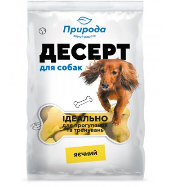 Десерт «Яєчний» для собак - печиво у формі кісточок та подушечок буде незамінним для всіх власників собак під час дресирування для закріплення навичок і створення теплих стосунків. Ласощі мають складати не більше 8-10% денного раціону собаки. Вони збагатять меню корисними речовинами та мікроелементами, допоможуть позбавитися неприємного запаху з пащі улюбленця, помасажують ясна, покращать травлення. Для виготовлення використовуються лише натуральні компоненти, в рецептурі немає консервантів та ГМО.