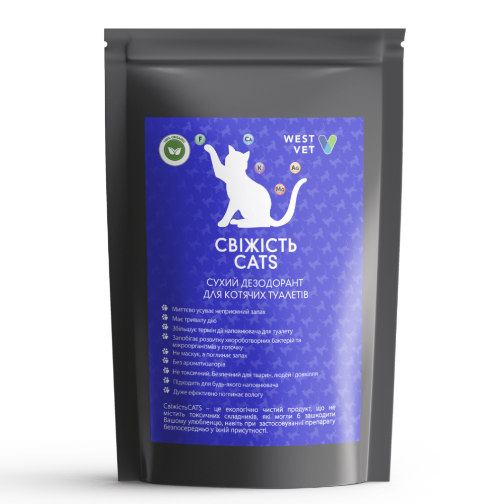 Сухий дезодорант для котячих туалетів «Свіжість Cats» миттєво усуває неприємний запах, збільшує термін дії наповнювача для туалету і запобігає розвитку хвороботворних бактерій та мікроорганізмів у лоточку. Підходить для будь-якого наповнювача, ефективно поглинає вологу, без ароматизаторів, не токсичний.