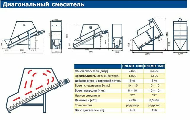 Діагональний змішувач NDM 1000 та NDM 1500 призначені для високоякісного змішування компонентів комбікорму в комбікормових цехах, на тваринницьких комплексах. Діагональний змішувач комбікорму добре підходить для змішування більшості порошкоподібних та гранульованих видів компонентів комбікорму з високою точністю. Крім того, змішувач під час змішування можна додавати рідкі компоненти, такі як жир, кормова патока і масло. Комбікорм поєднується завдяки повільному обертанню великого донного шнека, що дозволяє зберегти структуру сировини. Тому UNI-MIX також добре підходить для змішування кормів для великої рогатої худоби та телят, з роздробленим матеріалом, який має зберегти структуру.