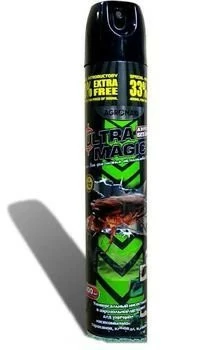 УЛЬТРА МАГІК – універсальний ефективний інсектицид в аерозольній упаковці без запаху - для знищення будь-яких літаючих та повзаючих комах (тарганів, мурашок, клопів, бліх, мух, комарів, молі тощо) з подвійним дією. Готове до побутового і комунального використання, забезпечує миттєве дію і тривалий залишковий ефект (21 день).