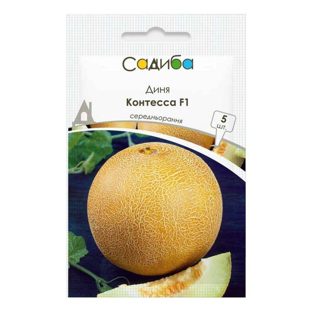 Диня Контесса F1 – середньоранній гібрид (65-70 днів від висадки розсади) типу Галія, призначений для вирощування у відкритому та закритому ґрунті. Рослина має сильний листовий апарат, формує 4-5 динь на кущі та вирізняється стійкістю до посухи та хвороб.
