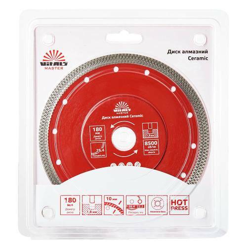 Алмазний диск Vitals Master Ceramic 180 мм призначений для чистого різу керамограніту, керамічної плитки, граніту, мармуру, декоративної плитки. Висота алмазного різального шару становить 10 мм, що дає змогу використовувати круг для великого обсягу робіт.