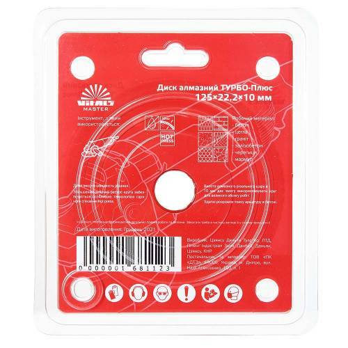 Диск алмазний Vitals Master ТУРБО-Плюс 125 мм використовується для роботи з такими матеріалами, як: бетон, цегла, граніт, залізобетон, черепиця, мармур. Висота алмазного різального шару становить 10 мм, що дає змогу використовувати круг для великого обсягу робіт.