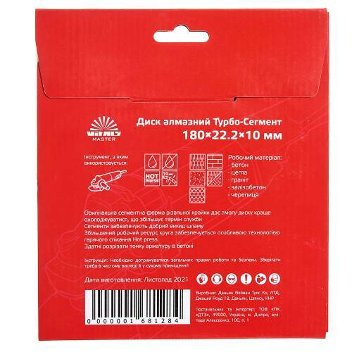 Алмазний диск Vitals Master Турбо-Сегмент 180×22.2×10 мм призначений для ефективного різання по бетону, цеглы, граніту, залізобетону та черепиці. Завдяки високим якісним показникам здатний розрізати тонку арматуру в бетоні.