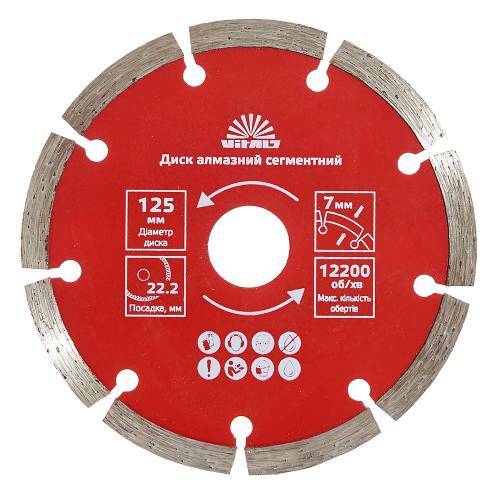 Диск алмазний сегментний Vitals 125х22.2х7 мм призначений для ефективного різання бетону, тротуарної плитки, цегли, граніту, каменю та черепиці. Може використовуватися як для сухого, так і для мокрого різання.