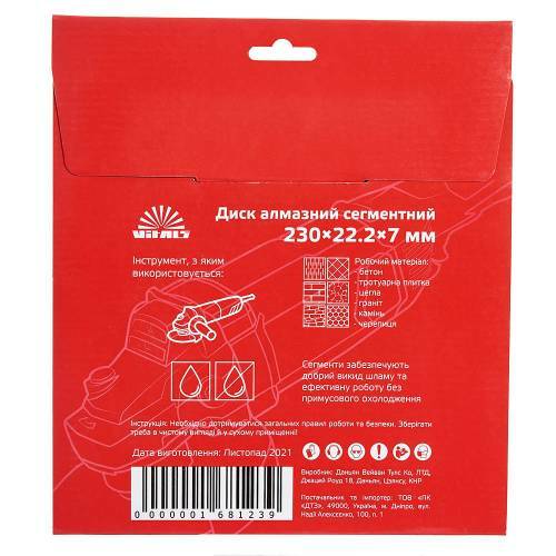 Диск алмазний сегментний Vitals230х22.2х7 мм призначений для ефективного різання бетону, тротуарної плитки, цегли, граніту, каменю та черепиці. Може використовуватися як для сухого, так і для мокрого різання.