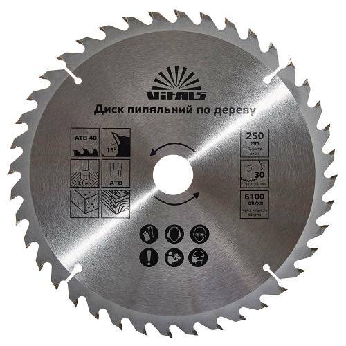 Пиляльний диск Vitals по дереву 250x30/25.4, ATB 40 підходить для поздовжнього та поперечного розпилу деревини - як м'якої, так і твердої породи, а також ДВП, ДСП.