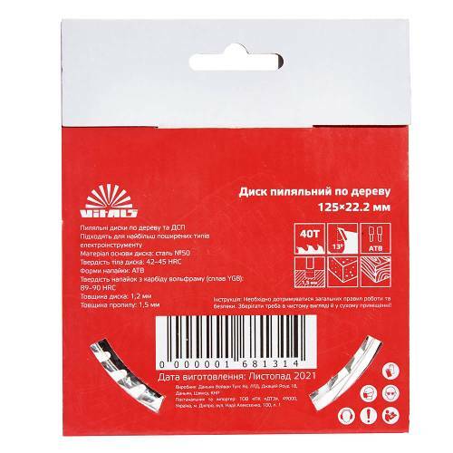 Пиляльний диск Vitals 125x22.2, ATB 40 підходить для поздовжнього та поперечного розпилу деревини - як м'якої, так і твердої породи, а також ДВП, ДСП.