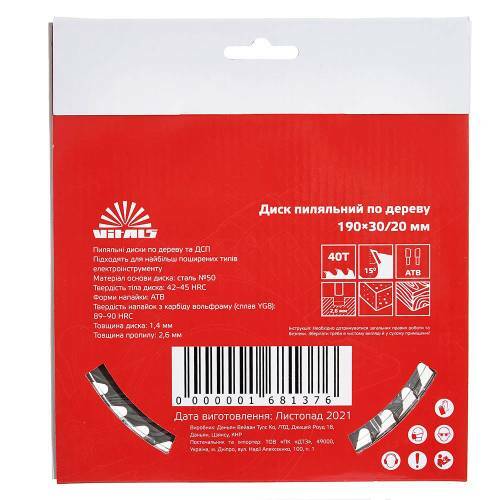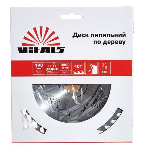 Пиляльний диск Vitals по дереву 190х30/20, ATB 40 підходить для поздовжнього та поперечного розпилу деревини - як м'якої, так і твердої породи, а також ДВП, ДСП.