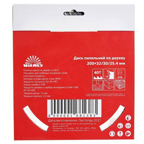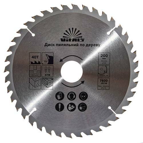 Пиляльний диск Vitals по дереву 200x32/30/25.4, ATB 40 підходить для поздовжнього та поперечного розпилу деревини - як м'якої, так і твердої породи, а також ДВП, ДСП.