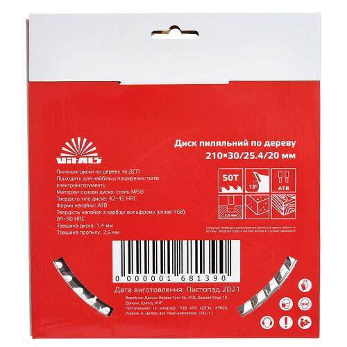 Пиляльний диск Vitals по дереву 210x30/25.4/20, ATB 50 підходить для поздовжнього та поперечного розпилу деревини - як м'якої, так і твердої породи, а також ДВП, ДСП.
