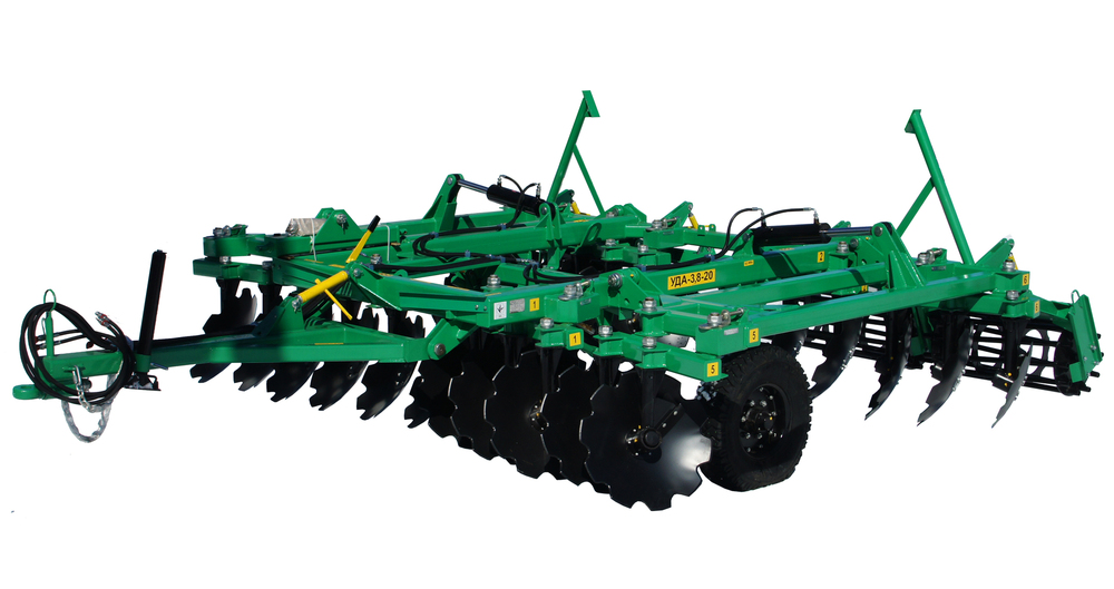 Дисковая борона УДА-3,8 полуприцепного типа оборудованная дисками, которые имеют вырезы, острую кромку. Измельчают остатки и сорняки, распределяют по всей глубине обработанного слоя почвы их, что предотвращает окисление почвы.