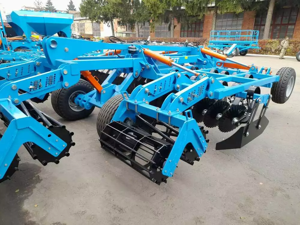 • Встановлений оптимальний у двох площинах кут атаки дисків забезпечує стабільність глибини обробітку, розпушування ґрунту, подрібненню та перемішуванню рослинних решток. Розташування дисків на відстані між ними 125 мм унеможливлює забивання рослинними рештками.