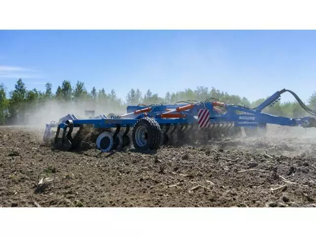 Дискатори DEFT – це універсальні Х-подібні дискатори від компанії Агромаш-Калина, які поєднали в собі найкращі конструктивні рішення відомих світових брендів і як результат – багатофункціональні, швидкісні, з раціонально скомпонованими робочими органами агрегати, які за один прохід виконують усі операції, необхідні для обробітку ґрунту й передпосівної підготовки по стерні чи по неораному полю з шириною захвату від 5 до 8 метрів. На сьогодні вже важко уявити сучасні енергозберігаючі високотехнологічні процеси вирощування сільгоспкультур без агрегатів даного типу. Диски Bellota зі спеціальної насиченої бором загартованої сталі незалежно з’єднанні з рамою за допомогою пружинної S- подібної стійки, яка виконує функції підвіски і демпфера захищає підшипники від можливих тимчасових динамічних навантажень. Пружинна 3 D стійка – завдяки переміщенню диска у трьох площинах, дає змогу краще копіювати мікрорельєф поля. На агрегатах DEFT установлені необслуговуючі дворядні радіально-упорні підшипникові вузли закритого типу FKL не потребують періодичного обслуговування і мають 2 роки гарантії від виробника. Колісні вузли від компанії STARCO забезпечують довговічну надійну експлуатацію в різних кліматичних та польових умовах.