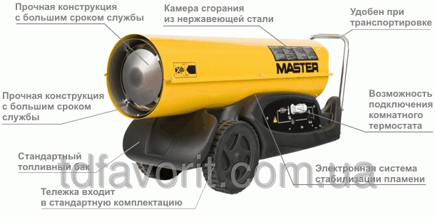 Такая тепловая дизельная пушка Master B 130 , благодаря увеличенной мощности тепловентилятора, способна выдавать мощный поток нагретого воздуха. В качестве дополнительной опции можно приобрести комнатный термостат. Поэтому обогрев помещения происходит довольно быстро. По сравнению с другими видами топлива, дизельное топливо значительно дешевле. Соответственно и эксплуатация такой пушки будет дешевле. Предназначена дизельная тепловая пушка для прогрева строительных площадок, складов, ангаров.