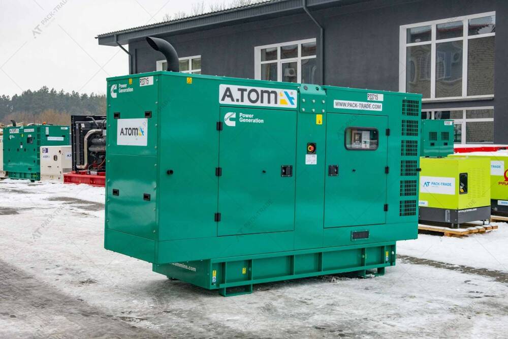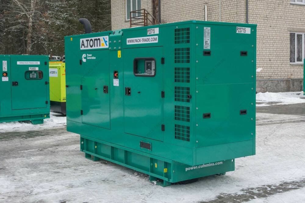 Дизельний генератор Cummins C150D5E. Максимальна потужність 120 кВт. Витрати палива при 100% навантаженні 26 л/год. Об'єм паливного баку 350 л.