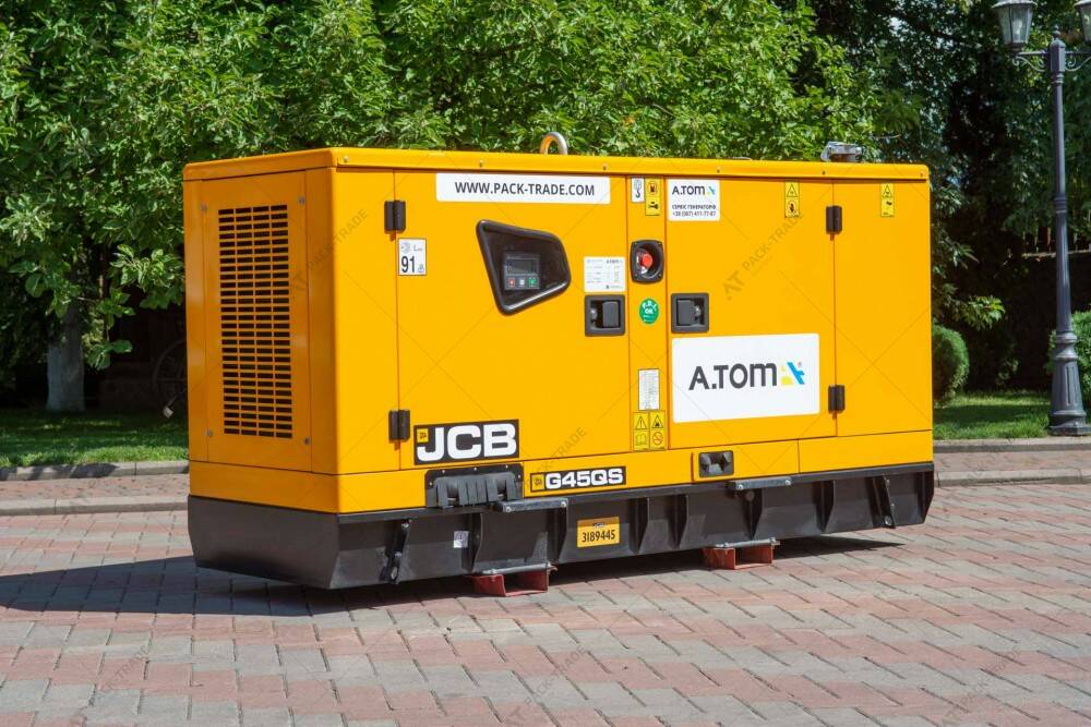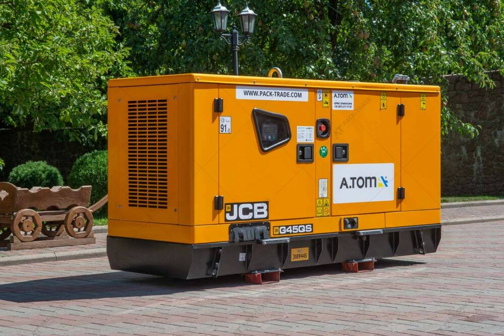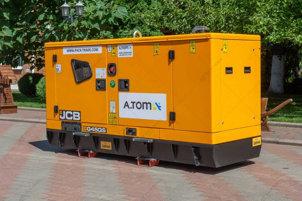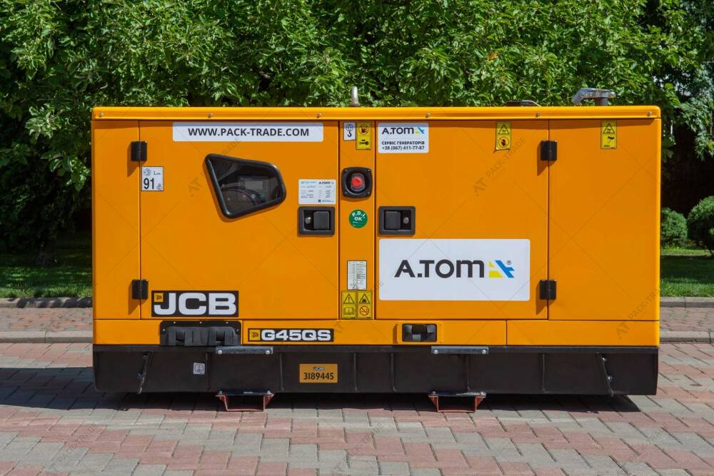 Дизельний генератор JCB G45QS 45 кВА. Максимальна потужність – 35,8 кВт. Витрати палива при 100% навантаженні – 9,5 л/год. Об'єм паливного бака – 81 л.