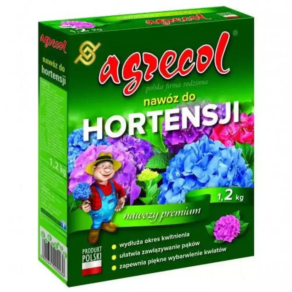 Високоякісне, кристалічне, спеціалізоване добриво для гортензій. Ця суміш повністю засвоюється рослинами та забезпечує всіма макро- та мікроелементами. Застосовують для всіх видів гортензій, а завдяки високому вмісту калію й алюмінію, підживлення забарвлює їх у ніжно-блакитний колір. Використовується для таких різновидів гортензій, як: гортензія садова, гортензія букетна, гортензія дуболіста, гортензія деревинна, гортензія пилоподібна, гортензія плетиста й багато інших. Сірка та калій, що входять до складу препарату Агрекол, підкислюють ґрунт, сприяють рівномірному забарвленню бутонів і їхньому здоровому росту, а також продовжують цвітіння й підвищують стійкість до захворювань і заморозків.