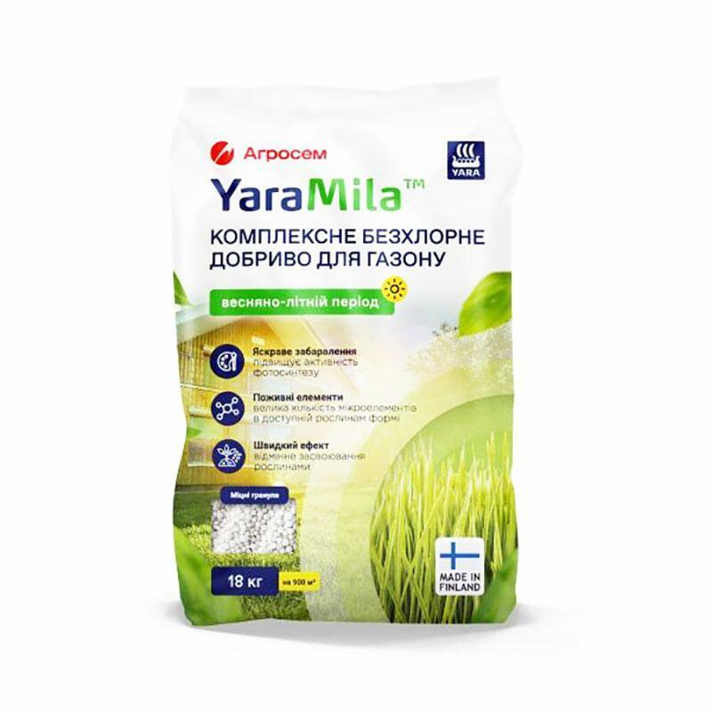 Добриво безхлорне для газону Весна-Літо YaraMila - це комплексне безхлорне добриво з мікроелементами для закладки газону та догляду за ним у весняний та літній періоди. Сприяє швидкому відростання трави після чергового скошування. Підвищує густоту травостою, перешкоджаючи поширенню моху і бур'янів. Забезпечує інтенсивне яскраво-зелене забарвлення газону. При використанні добрива YaraMila у рослин газону підвищується імунітет – вони будуть швидше проростати, краще переносити несприятливі умови, будуть стійкішими до хвороб та шкідників. В кожній гранулі добрива знаходяться всі елементи живлення, які дають рослинам енергію, розвиток та ріст.