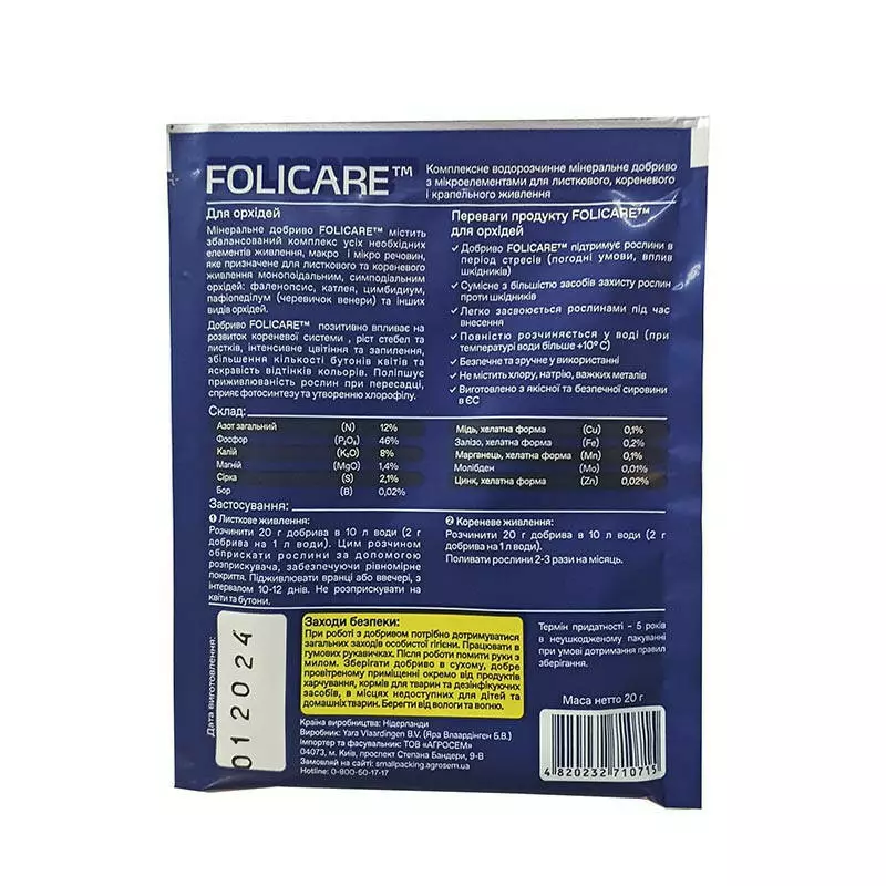 Добриво для орхідей Folicare® - це водорозчинне мінеральне добриво, що містить збалансований комплекс елементів живлення як макро так і мікро речовин, призначене для листкового та кореневого живлення монопоідальним, симподіальним орхідей: фаленопсис, катлея, цимбидиум, пафіопеділум (черевичок венери) і багатьом іншим видам орхідей.
