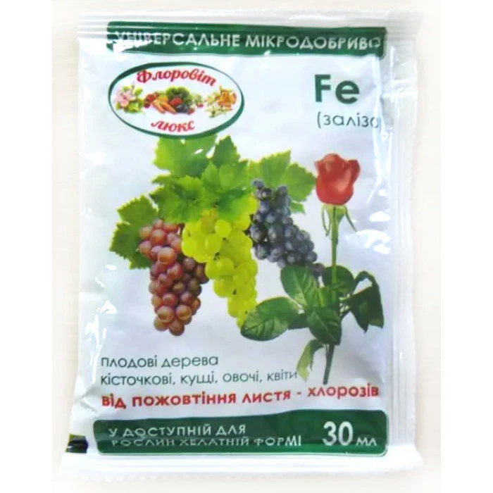 Мініраліс Fe (Залізо) - високоефективне рідке мікродобрива, призначене для позакореневого підживлення сільськогосподарських культур, чутливих до дефіциту заліза. Склад мікродобрива «Мікро-Мінераліс» (Залізо), амонійно-карбоксилатних комплексонів, % Fe N 2,0 2,0 Роль заліза в житті рослин Залізо бере участь у функціонуванні основних елементів електронно-транспортних ланцюгів дихання та фотосинтезу, у відновленні молекулярного азоту та нітратів до аміаку, що каталізує початкові етапи синтезу хлорофілу. Недолік заліза часто має місце при перезволоженні на карбонатних, на погано дренованих ґрунтах, проявляється у пожовтенні листя (хлороз) та зниженні інтенсивності окисно-відновних процесів. Нестача заліза призводить до:міжлисткового хлорозу молодого листя; пожовтіння всієї листової пластини; формуванню дрібного листя; зниження вмісту цукрів. Переваги препарату Завдяки інноваційній технології виробництва мікродобрива Мікро-Мінераліс (Залізо) характеризується високою біодоступністю для рослинних клітин. Має високу ефективність завдяки прискоренню ферментативних реакцій, які впливають обмін речовин. Покращує інтенсивність дихання та біо та фотосинтез. Позитивно впливає якість врожаю. Профілактика хлорозу: розчинити вміст пакету 30 мл у 10 л води та обприскувати цим розчином листя рослин, не допускаючи стікання. Обробити 2-3 рази, починаючи з появи першого листя, з інтервалом 2-3 тижні. Лікування хлорозу рослин: розчинити вміст пакету 30 мл у 5 л води для фруктових дерев або у 7 л води для інших культур. Обприскувати цим розчином листя рослин, не допускаючи стікання. Обробити 4 рази з інтервалом 2 тижні.