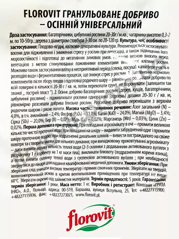 Добриво універсальне Флоровіт (Florovit)1 кг осінній