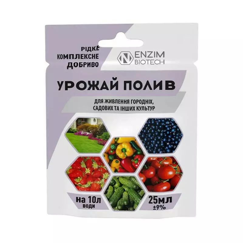 Добриво Урожай Полив - рідке хелатне мікродобриво, призначене для забезпечення потреб культур в основних елементах живлення протягом вегетації. Застосовується для підживлення овочевих, плодово-ягідних, декоративних та інших рослин закритого та відкритого ґрунту.