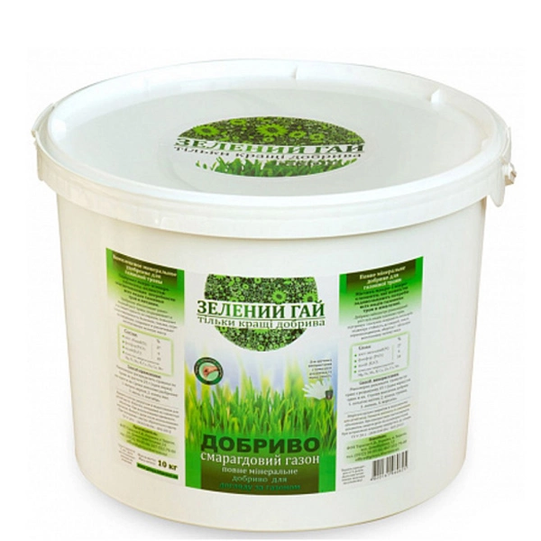 Зелений Гай Смарагдовий газон - комплексне мінеральне добриво для всіх видів газонної трави. Посилює яскравість забарвлення трави, підвищує стійкість до захворювань, гнилі, переохолодження, а також сприяє збільшенню вегетативної маси.