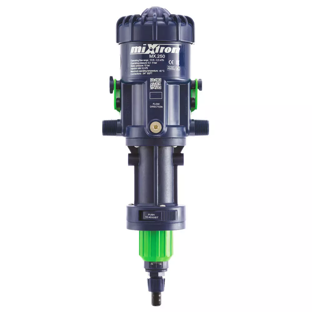 Пропорційні об'ємні дозатори Mixtron використовують рушійну силу води для змішування та створення гомогенного розчину, завжди пропорційного об'єму води, введеної в сам дозатор, незалежно від змін витрат або тиску. Завдяки своїм характеристикам дозатор не вимагає електрики, що робить його практичним та гнучким рішенням.
